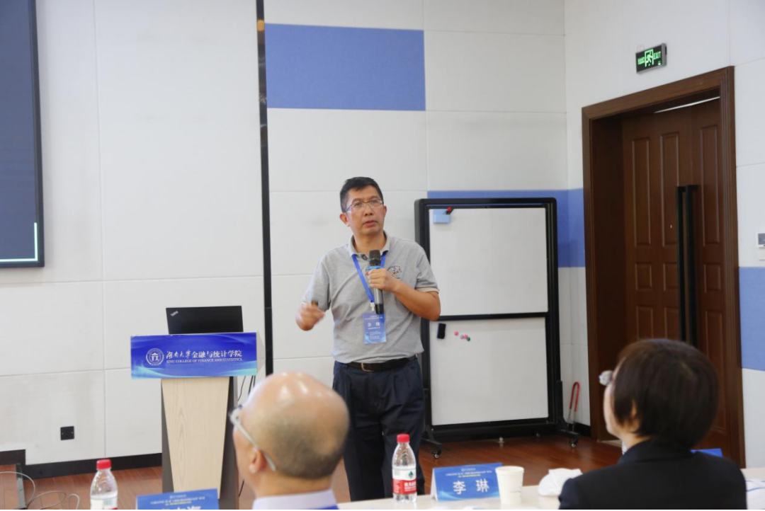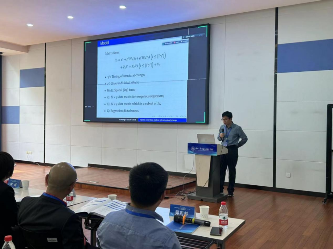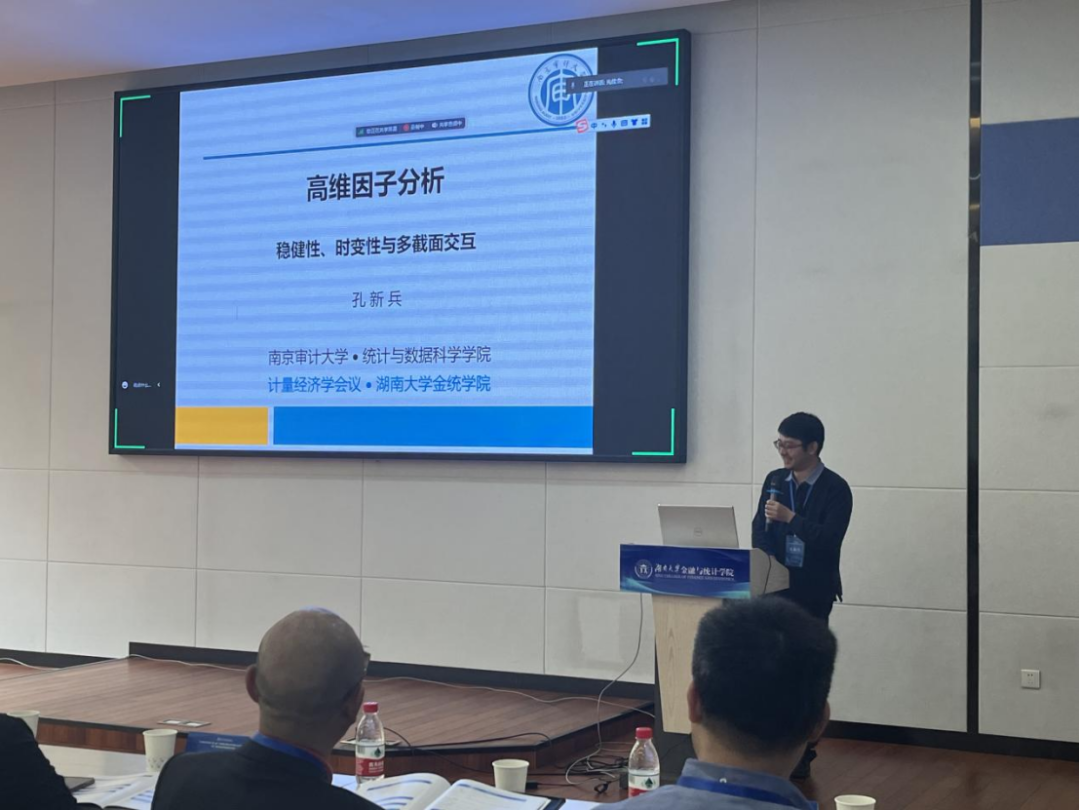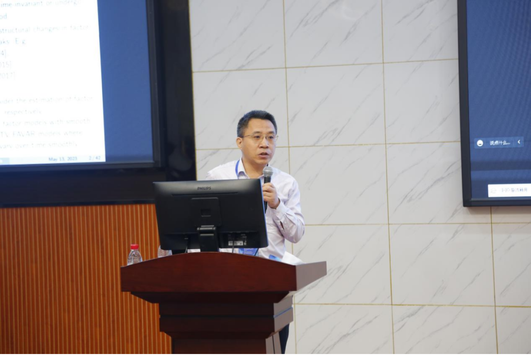 第三时段主旨报告由厦门大学吴吉林教授主持。西南财经大学常晋源教授、南京审计大学孔新兵教授以及首都经济贸易大学李鲲鹏教授分别做主旨演讲。常晋源教授以《高维函数型时间序列的建模和预测》为题分享了自己的研究。该项研究主要探讨了高维时间序列函数型数据,提出了一种两步建模与预测方法:首先通过矩阵的特征分析将原始高维函数型数据分类,然后再对各个类别的数据进行降维分析。孔新兵教授以《高维因子分析—稳健性、时变性与多截面交互》为题分享了最新的研究。该研究从高维因子分析出发,分别基于稳健性、时变性与多截面交互三个特点提出了新的估计方法。特别地,为了放松传统因子分析中严格的矩条件,孔新兵教授创新地提出了一个基于Huber函数的因子估计方法,并将其应用于实证数据分析中,展示了该方法优越的有限样本性质。李鲲鹏教授以《具有结构变化的空间面板数据模型》为题分享了空间面板数据的最新研究。该研究从经济学研究中常见的空间面板数据出发,放松了参数稳定性的假设,提出并研究了具有结构变化的空间面板数据模型。特别地,李鲲鹏教授首先提出使用拟极大似然方法来估计一个静态的空间自回归面板数据模型,然后在两个方向(动态模型以及N比较大,T固定的模型)上扩展了对应的理论研究。最后,通过数值模拟,说明该方法具有优良的有限样本性质。