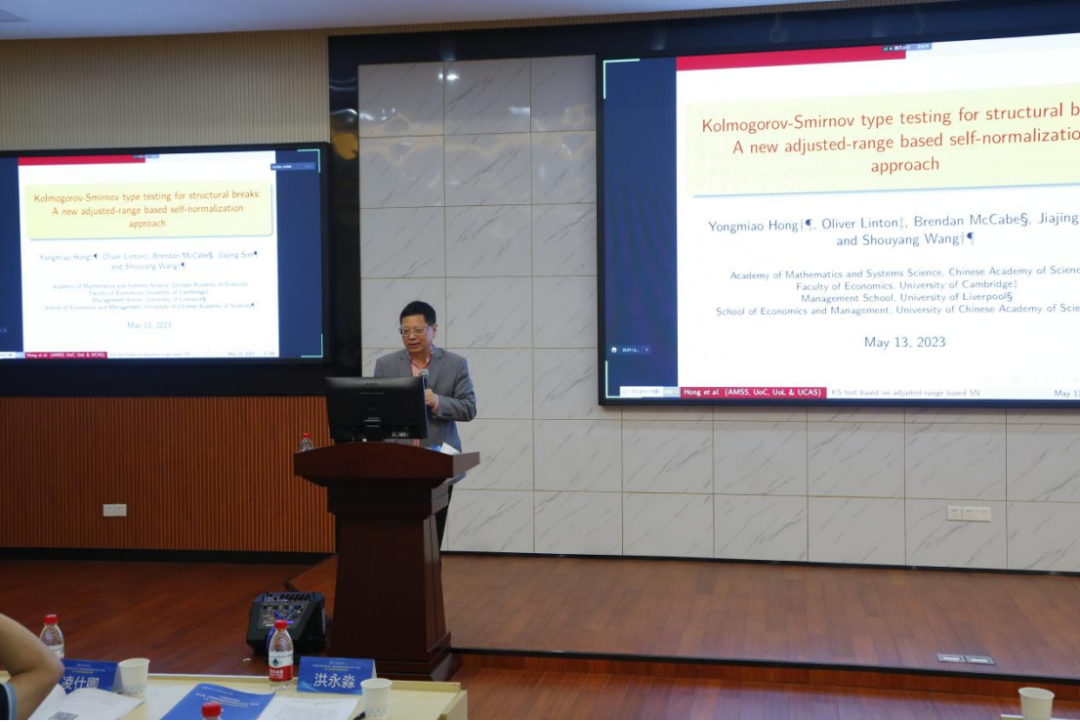 本次研讨会共有三个时段的七场特邀报告和一场青年学者圆桌论坛。第一时段特邀报告由球王会副经理李海奇教授主持。中国科公司大学洪永淼教授和清华大学苏良军教授分别作了主旨演讲。洪永淼教授针对结构变点检验问题、基于极差提出了一种新的Kolmogorov-Smirnov型检验统计量,能够缓解现有Kolmogorov-Smirnov检验统计量中的检验势损失(power loss)问题。洪永淼教授生动形象地解释了其提出的新检验背后的经济直觉,并对其理论性质进行了深入探讨。苏良军教授从因子模型出发,考虑了因子载荷的时变特征。他指出直接应用sieve主成分分析方法存在识别问题,并为解决这一问题提出了基于sieve方法的两阶段估计方法。首先,利用核范数正则化方法获得因子与因子载荷的初步一致估计。其次,通过迭代对偶最小二乘方法估计因子与因子载荷。最后,苏良军教授详细阐述了基于sieve方法两阶段估计的理论性质。