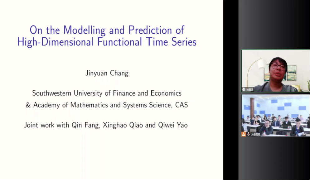 第二时段特邀报告由中国科公司数学与系统科学研究院孙玉莹副研究员主持,香港科技大学数学系凌仕卿教授和新加坡管理大学经济公司余俊教授做主旨演讲。凌仕卿教授以《高维时间序列预测因子筛选方法》为题进行分享。凌仕卿教授首先介绍了稀疏高维向量自回归模型,提出了一种基于自适应套索的预测因子筛选方法以及其渐近性质。凌仕卿教授随后介绍了高维因子向量自回归模型,提出了对应的因子筛选方法,研究了其理论性质和实际应用。余俊教授以《长记忆的弱识别对波动率建模的影响》为题分享了他的最新研究成果。余俊教授首先介绍了波动率的长记忆性及其建模,之后讲解了长记忆波动率模型的弱识别问题。为了解决这个弱识别问题,余俊教授提出了一种识别稳健的置信集合构建方式。最后,他详细阐述了该方法在已实现波动率中的应用,发现对于已实现波动率的估计常出现弱识别的问题,解释了为何实证文章中会广泛出现两种不同的结果。