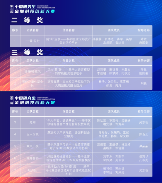 近日,第二届中国研究生金融科技创新大赛决赛在复旦大学举行,我院共有8支参赛队伍获奖,“一‘麓’前行”团队获初创赛道二等奖,“诚·星城·意队”等7支队伍获初创赛道三等奖。