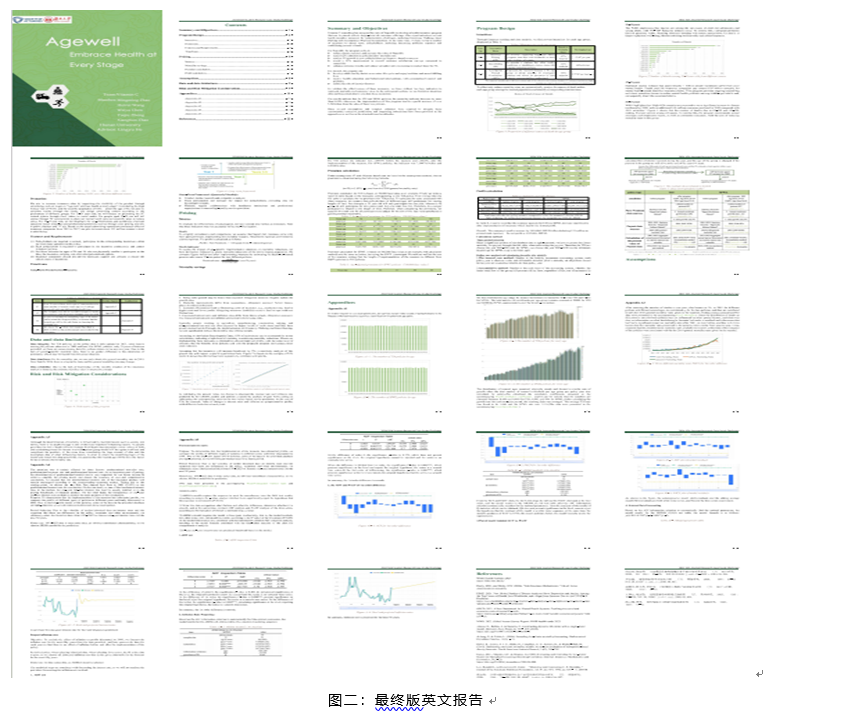 本次赛题是关于与长期寿险保单捆绑的健康激励措施设计,SOA发布的题目要求是长达六页的全英文PDF,此外所给出的虚拟数据库形式独特,既考验参赛团队处理已有数据的能力,也留下了预测和模拟的空间。为准备本次比赛,团队成员复习了课内所学的保险学原理、金融数学、寿险精算模型等相关知识,并阅读了往年的优秀论文,同时广泛了解全球针对各类疾病提出的健康管理方案,以便将理论知识更好地与题目要求相结合。最终通过甄选合理模型,反复打磨关键词,设计整体配色排版,团队形成了十页全英正文报告。