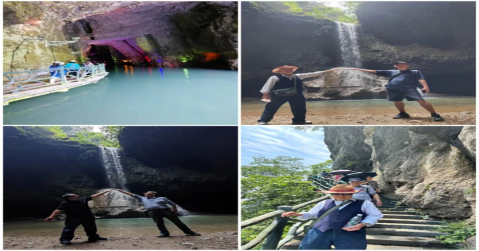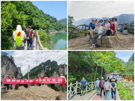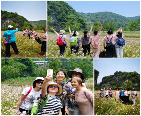 湄江的自然景观类型为岩溶地貌,有着千姿百态的地表和地下景观,具备了建立国家地质公园的基本条件。在湄江风景区,老同志们漫步在塞海湖旁的亲水栈道,欣赏着绝壁美景;在国家地质博物馆,听讲解员介绍当地的地质地貌,风土人情;女老师们沉浸在花海里拍照留念;在仙人府溶洞里,大家头顶钟乳石,沿着溪水慢步,纷纷在瀑布前打卡合影,观看着大自然在高山上雕刻出来的“MJ”这个湄江的缩写;有的老师甚至爬上了更高处,领略湄江的美好风光。参观完毕,老师们品尝着当地的风味美食,流连忘返。
