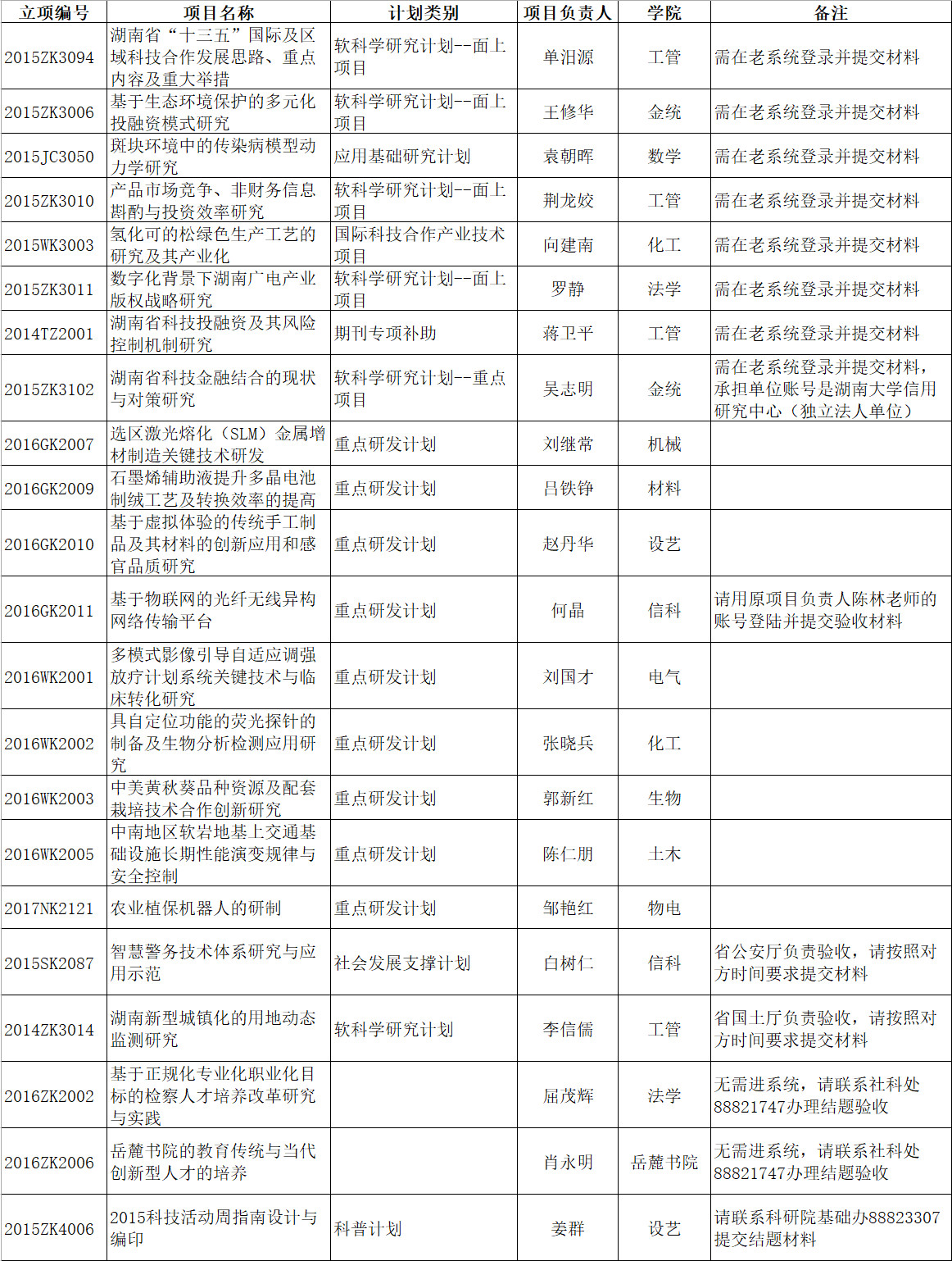 根据湖南省科学技术厅2018年7月发布的《关于开展2018年度湖南省科技创新计划验收工作的通知》(见附件1)、《中共中央办公厅国务院办公厅关于深化项目评审、人才评价、机构评估改革的意见》和《湖南省科技发展计划专项资金管理办法》等文件要求,现开展公司本年度湖南省科技创新计划项目的结题验收工作,有关事项通知如下: